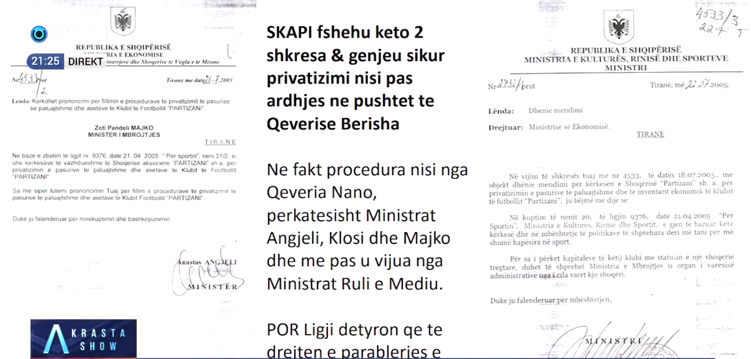 “Procesi i privatizimit ka nisur nga qeverisja e Fatos Nanos. Dosja fillon me dorëzimin nga Balla më 1 dhjetor 2020 në SKAP të kallëzimit krejt të rremë. Balla thotë se territory i kluibit u privatizua në një kohë kur pronarët ishin dëmshpërblyer ngha itasalia që kishte privatizer terrenin për të ndërtuar aeroportin. Italianët me dy dekrete, faktohet. kanë bërë rekuizimin dhe pushtimin, bllokim të përkohshëm. Nëse shpronësohet toka ajo mbetet pronë e italianëve.Dekreti i parë është në vitin 1942 dhe një tjetër në qershor 1943 ku thotë se zgjatet edhe 6 muaj rekuizita. Nuk ka qenë kurrë e shpronësuar. Mbi këtë bazë pronarët kanë ërë gjyqe me njëri-tjetrin për të ndarë pronat e tyre. SPAK i ka fshehur shkresat që kemi dorëzuar. Ndryshimi e destinacionit nga terren sportiv në banim në vitin 2006. Edi Rama dhe 12 drejtorët e tij thotë se do jetë zonë urbane. Unë e firmoa dokumentin sepse nuk kisha asnjë bazë ligjore të bëja asnjë veprim të vetëm.” – tha Berisha.