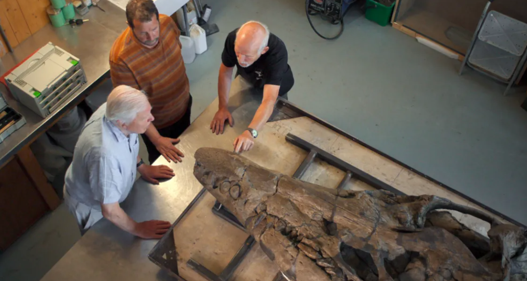 Dhëmbët e mëdhenj të një “përbindëshi gjigant deti” u rivendosën nga eksperti i fosileve Chris Moore pasi ai dhe Steve Etches duruan detyrën e mundimshme të heqjes së një kafke të madhe fosile 12 metra lart në një shkëmb në Dorset, Britani.