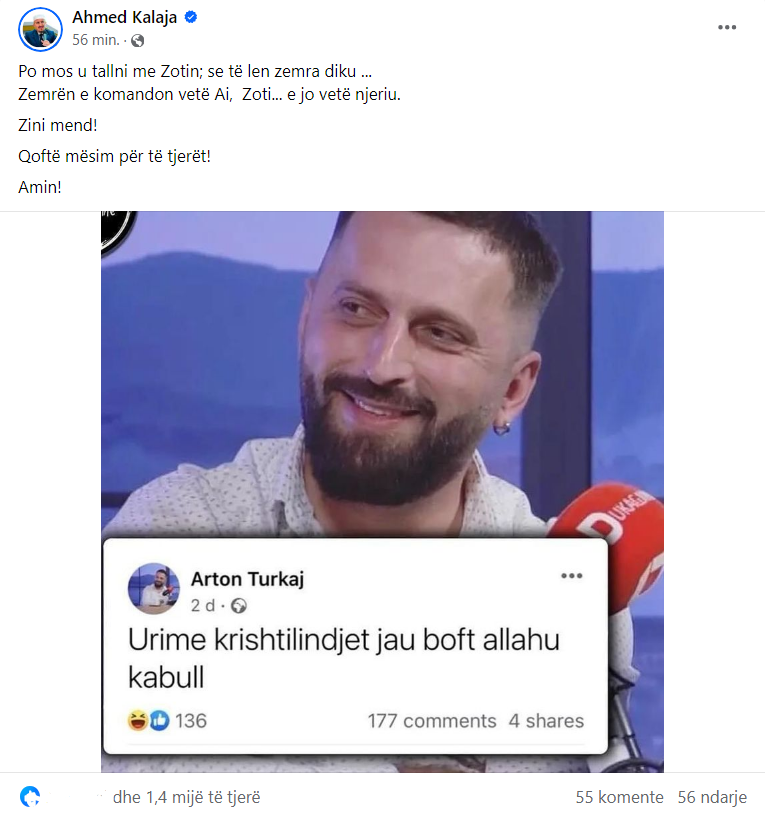 Këtë deklaratë Kalaja e bëri në rrjetet sociale duke shpërndarë një postim të gazetarit në ditën e Krishtlindjes i cili shkruante “urime krishtlindjet, jau boft allahu kabull”.