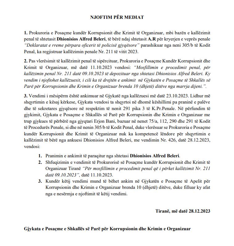 Me anë të një vendimi të gjyqtarin, Erjon Bani, thuhet se SPAK nuk ka kompetencë lëndore për shqyrtimin e kallëzimit të bërë nga ankuesi Dhionisios Alfred Beleri. Në këtë mënyrë, gjykata pranon ankimin e Belerit.