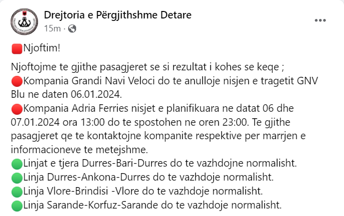 Kompania Adria Ferries nisjet e planifikuara ne datat 06 dhe 07.01.2024 ora 13:00 do te spostohen ne oren 23:00. Te gjithe pasagjeret qe te kontaktojne kompanite respektive per marrjen e informacioneve te metejshme.