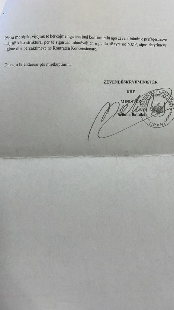 Në fund të këtij dokumenti, Belinda Balluku nënvizon se: “Mos ushtrimi i detyrave të NJZP, mungesa e pjesmarrjes në takimet periodike dhe mos raportimi pranë Autoritetit Kontraktor, shkakton vonesa dhe problematika në realizimin e projektit, me rrezik cënimit e interesave të palës shtet.”