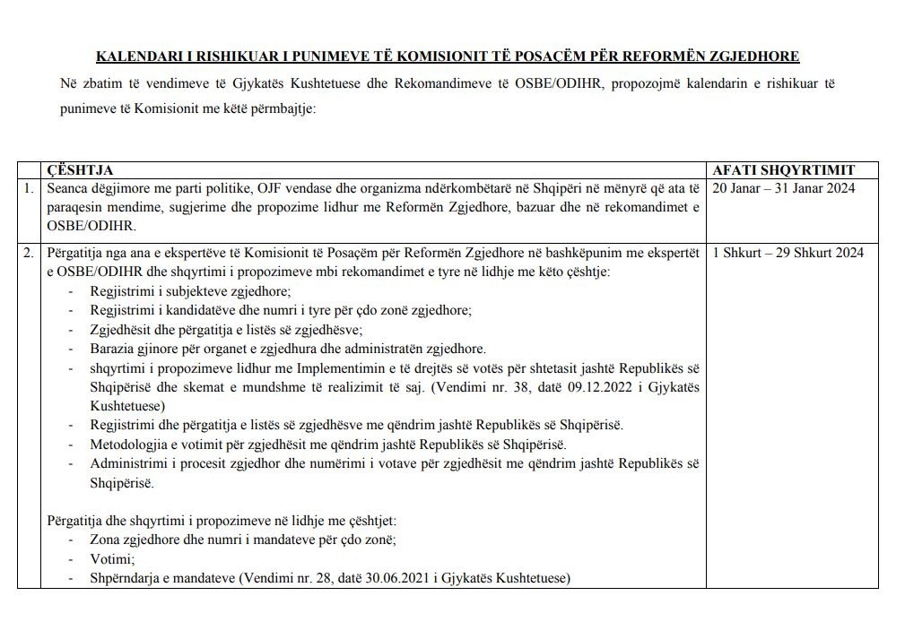 Në zbatim të vendimeve të Gjykatës Kushtetuese dhe Rekomandimeve të OSBE/ODIHR, thuhet se pika e parë e kalendarit është; Seanca dëgjimore me parti politike, OJF vendase dhe organizma ndërkombëtarë në Shqipëri në mënyrë që ata të paraqesin mendime, sugjerime dhe propozime lidhur me Reformën Zgjedhore, bazuar dhe në rekomandimet e OSBE/ODIHR.