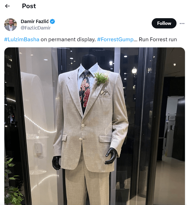 Nëpërmjet një postimi në rrjetet sociale, biznesmeni Fazliç krahas një fotoje të një manekini, shkruan: “Lulzim Basha në ekspozitë të përhershme. Vrapo Forrest vrapo.”