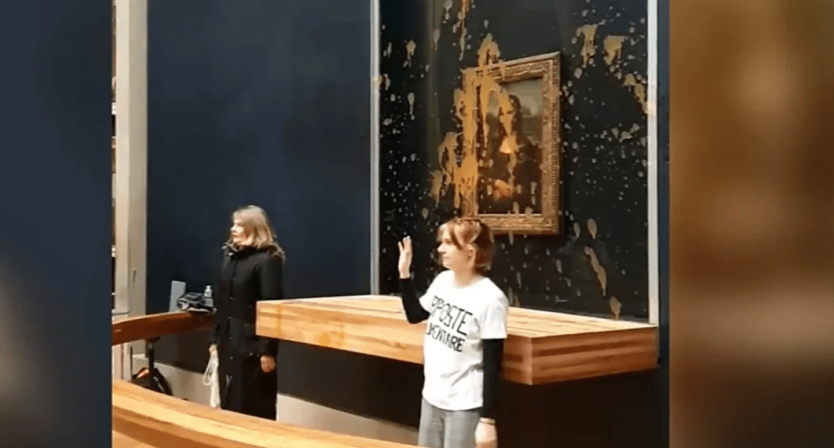 Protestuesit hodhën supë mbi pikturën e Mona Lizës në Paris të dielën, por ajo u mbrojt nga dëmtimi nga kutia e saj prej xhami.