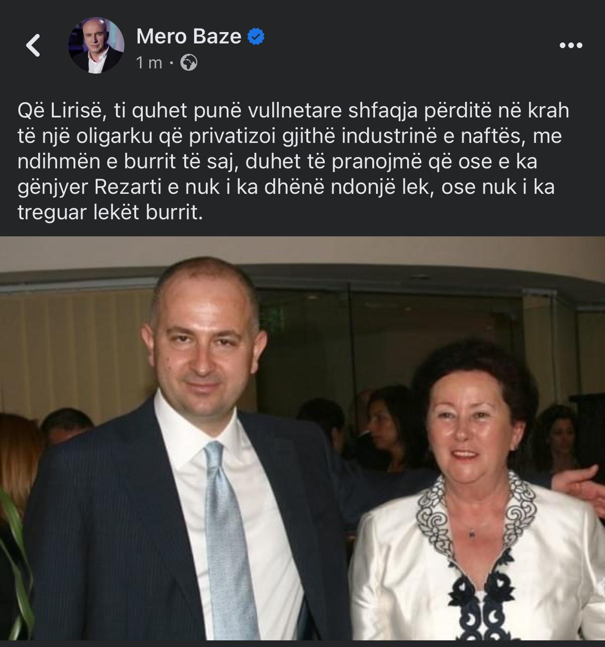 “Që Lirisë, ti quhet punë vullnetare shfaqja përditë në krah të një oligarku që privatizoi gjithë industrinë e naftës, me ndihmën e burrit të saj, duhet të pranojmë që ose e ka gënjyer Rezarti e nuk i ka dhënë ndonjë lek, ose nuk i ka treguar lekët burrit”-shkruan Baze.