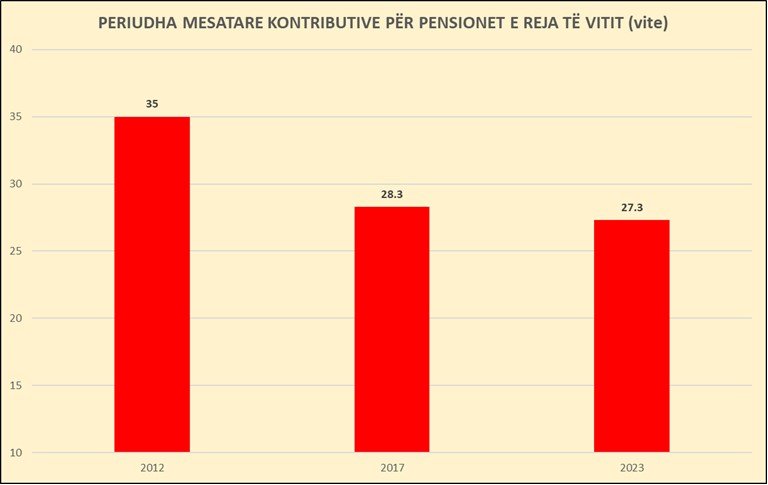 Personat që dolën në pension në vitin 2012 kishin paguar mesatarisht 34 vite sigurime dhe në vitin 2023 vetëm 27. Mosplotësimi i kriterit të viteve të punë me sigurime ul në mënyrë të jashtëzakonshme përfitimet nga pensioni.