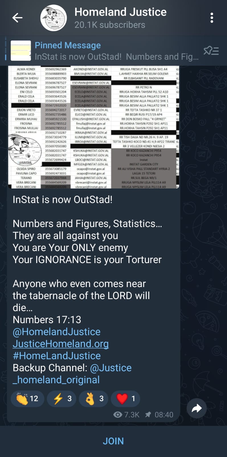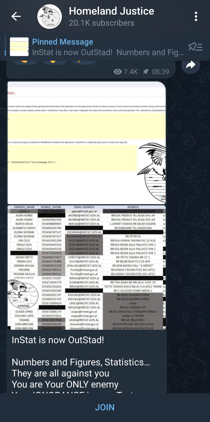 Faqja e Institutit Shqiptar të Statistikave duket se ka rënë pre e një grupi hakerash iranianë, Homeland Justice.
