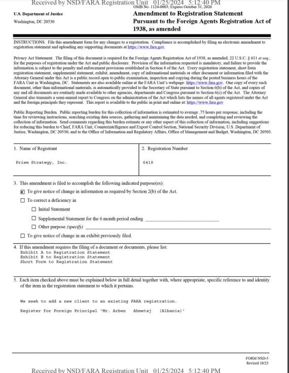 Arben Ahmetaj ka kontraktuar një kompani lobimi në SHBA.