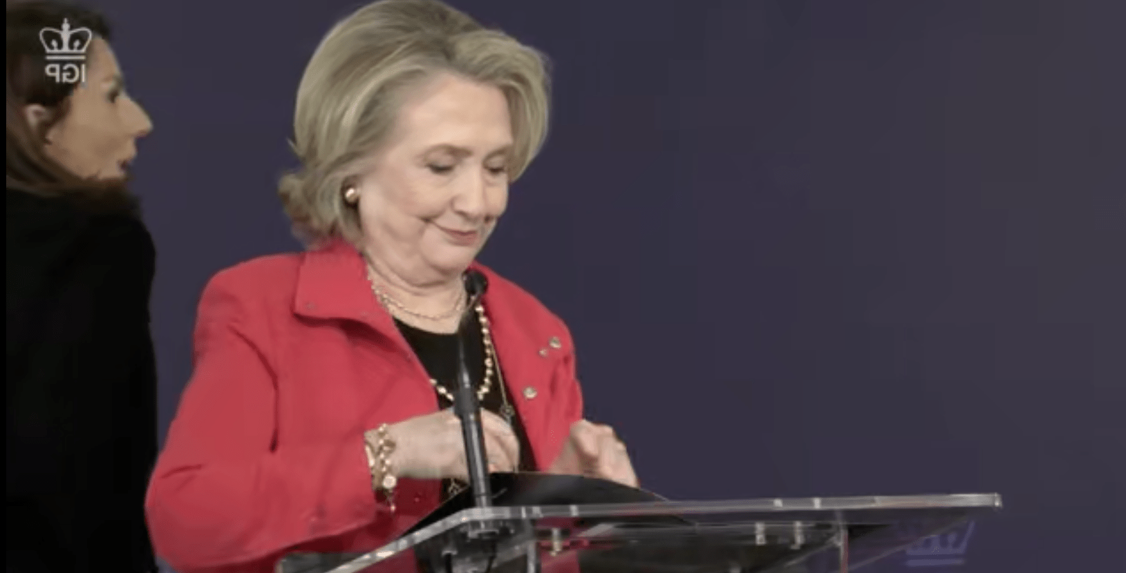 Clinton u ndërpre teksa doli në skenë për të mbajtur një leksion mbi dhunën seksuale të lidhur me konfliktin në Universitetin e Columbias në Nju Jork, ku ajo është Profesoreshë e Marrëdhënieve Ndërkombëtare dhe Publike.