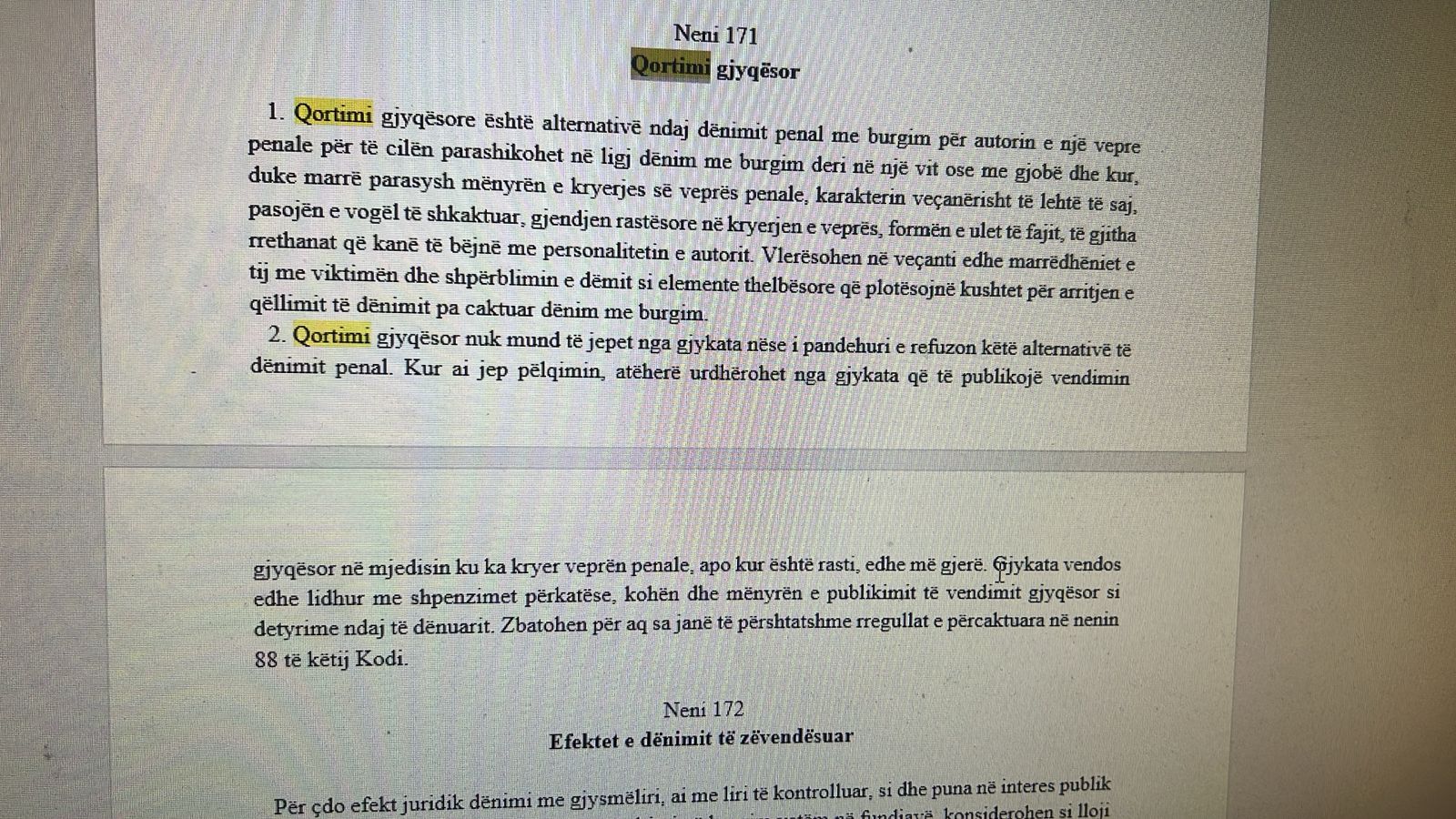 Anila Hoxha: Si figurë e re është shumë risi sa i takon dënimeve alternative. Dënimet alternative përfshijnë disa dënime, mes tyre dhe dënimin me kusht, pra ku shmanget vuajtja e vendimit gjyqësor në qeli. Midis tyre është futur dhe qortimi gjyqësor që është figurë e re dhe risi në rast se do aprovohet nga të gjitha aktorët.