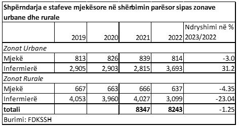 Ndërsa në shërbimin parësor të zonave rurale numri i mjekëve për 2022 ishte 637. Krahasuar me vitin paraardhës numri i tyre ra 4. Ndërsa numri i infermierëve për 2022 u pakësua 23%.