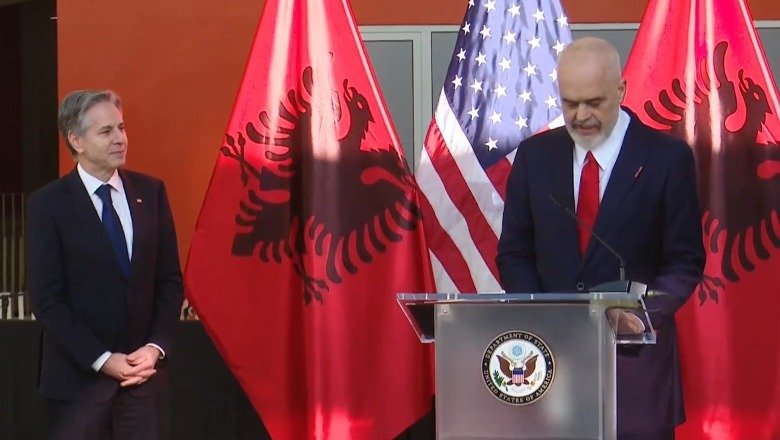 Ora 18:10 Sekretari Blinken dhe kryeministri shqiptar Edi Rama mbajnë një konferencë të përbashkët për shtyp në Tiranë, Shqipëri.