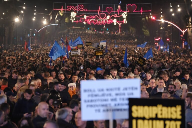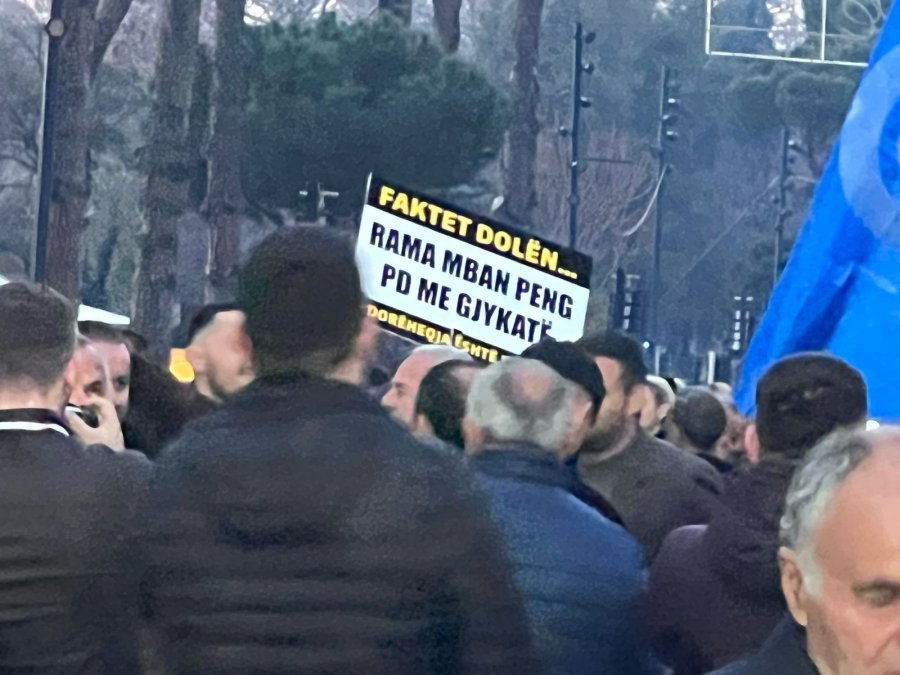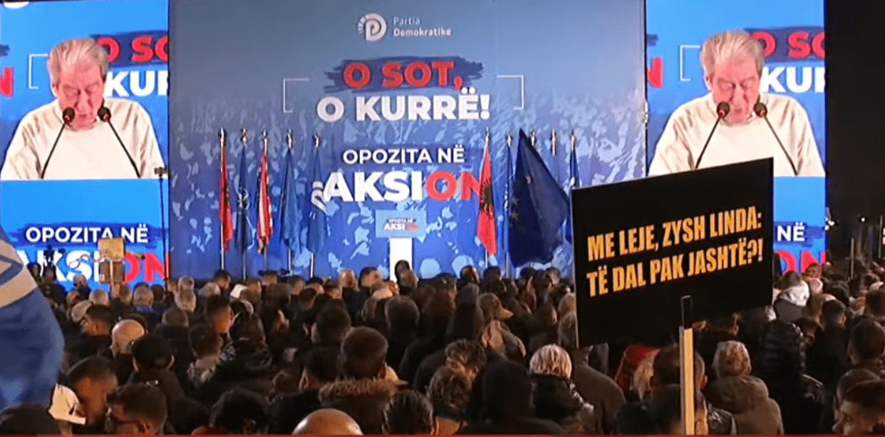 Sali Berisha për të mos munguar me fjalën e tij në protestë u shfaq virtualisht në protestë sikur të ishte fizikisht në podiumin e instaluar përballë kryeministrisë.
