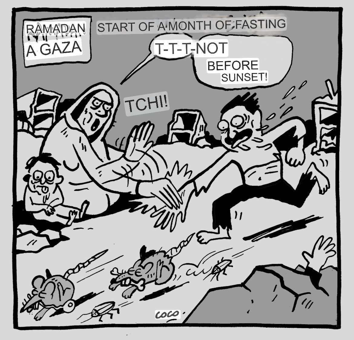 Karikatura ‘Ramazani në Gaza’ tregon një fëmijë palestinez që përpiqet të kapë një mi ndërsa e ëma i thotë që të presë deri për iftar (koha në mbrëmje e ngrënies së ushqimit).