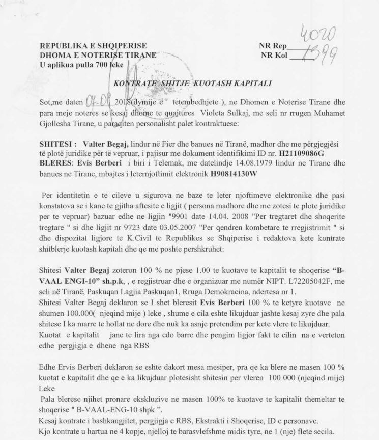Në 7 shtator 2028, Evis Berberi, drejtor i ARRSH-së, i bleu Valter Begajt kompaninë ‘B-VAAL ENG-10’, me nipt L72205042F, për 100 mijë lekë. Kompania e themeluar në tetor 2017 kishte dhe ka si objekt studim, projektim, mbikëqyrje dhe kolaudim objektesh ndërtimore etj.