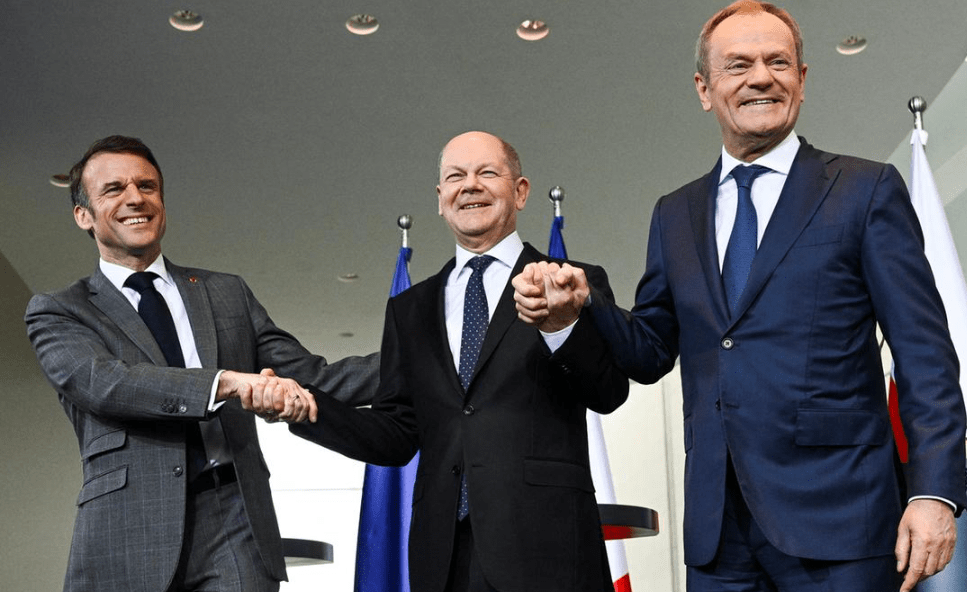 Kancelari gjerman, Olaf Scholz mirëpriti presidentin francez, Emmanuel Macron dhe kryeministrin polak, Donald Tusk në një samit të quajtur “Trekëndëshi i Weimarit”.