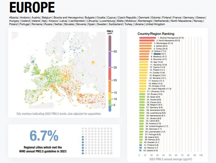 Në vitin 2023, 7% (135) e qyteteve në rajon arritën udhëzimin vjetor të OBSH-së për PM2.5 prej 5 µg/m3, duke përfshirë çdo qytet në Islandë.