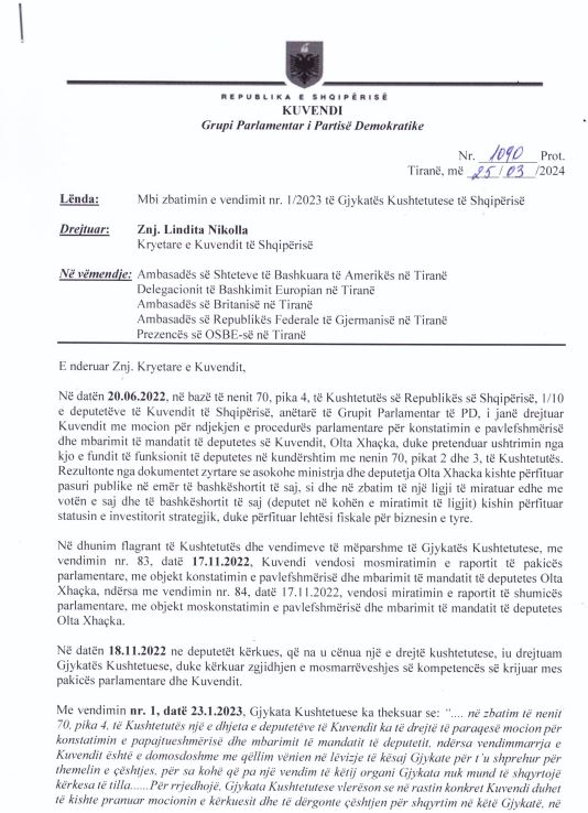 Kryetari i Grupit Parlamentar të PD-së, Gazment Bardhi i është drejtuar sot zyrtarisht Kuvendit që të zbatojnë vendimin e Gjykatës Kushtetuese për mandatin e Olta Xhaçkës, i cili nuk zbatohet prej 1 viti e dy muaj.