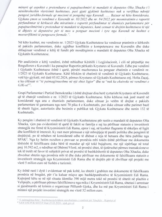 Në shkresën e Grupit Parlamentar të PD theksohet se Kuvendi duhet të përmbush detyrimet e tij, ndërkohë që presin nga SPAK që të hetojë në mënyrë të plotë dhe të gjithëanshme sesi këto dy subjekte private (Artan Gaçi dhe Pëllumb Gjoka), me lidhje të ngushta me Qeverinë, përmes dokumenteve të falsifikuara kanë kaluar filtrat e kontrollit të ekzekutivit dhe kanë përfituar statusin e investitorit strategjik, duke evidentuar qartë rolin e Kryeministrit dhe të cilido tjetër që është përfshirë në këto raste.