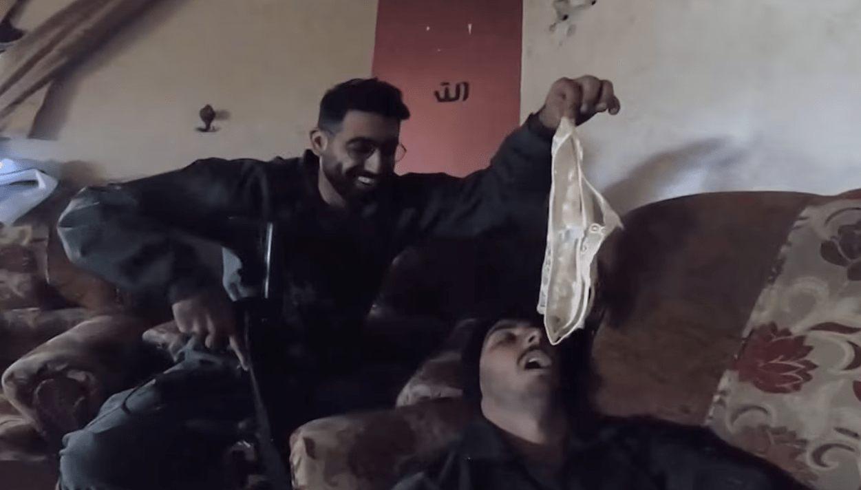 Në një video, një ushtar izraelit ulet në një kolltuk në një dhomë në Gaza duke buzëqeshur, me një armë në njërën dorë dhe të brendshmet prej sateni në tjetrën mbi gojën e hapur të një shoku të shtrirë në një divan.