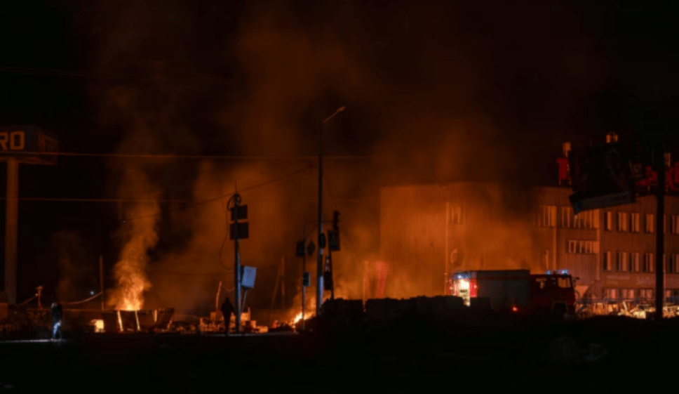 Policia ukrainase tha se sulmi u krye me dronë. Ajo publikoi pamje të zjarrit të shkaktuar nga sulmi në rrugë pranë një ndërtese banimi.