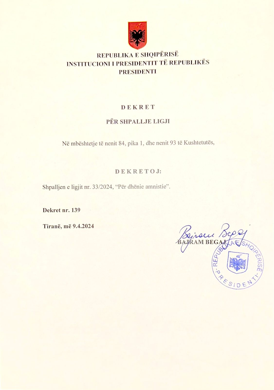 Presidenti i Republikës, Sh. T. Z. Bajram Begaj, firmosi sot dekretin nr. 139, datë 09.04.2024, “për shpalljen e ligjit nr. 33/2024 “Për dhënie amnistie”.