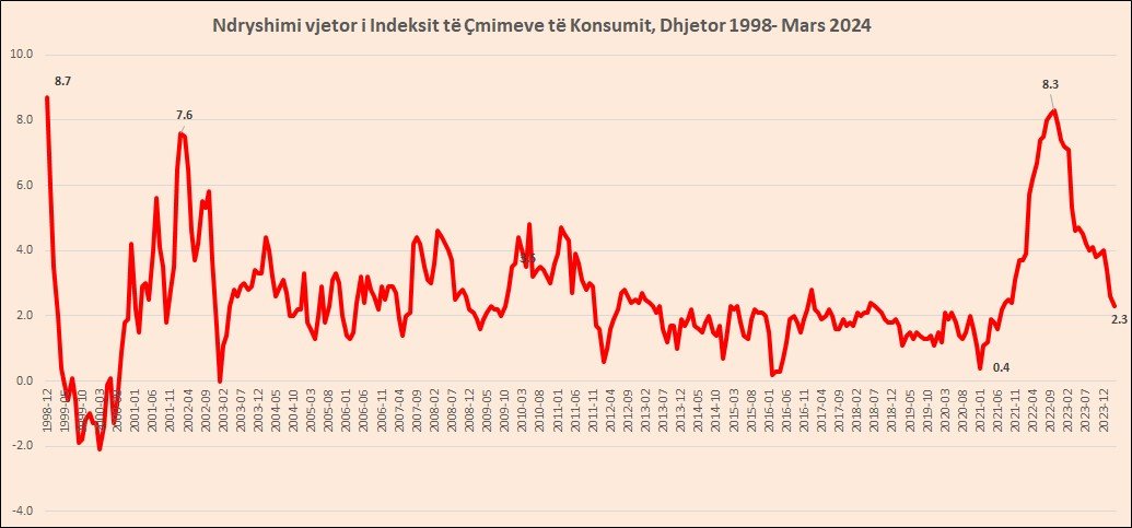 Rritja e çmimeve është ngadalësuar ndjeshëm gjatë muajve të fundit. INSTAT bëri të ditur se ndryshimi vjetor i indeksit të çmimeve të konsumit në muajin mars 2024 është 2.3%.