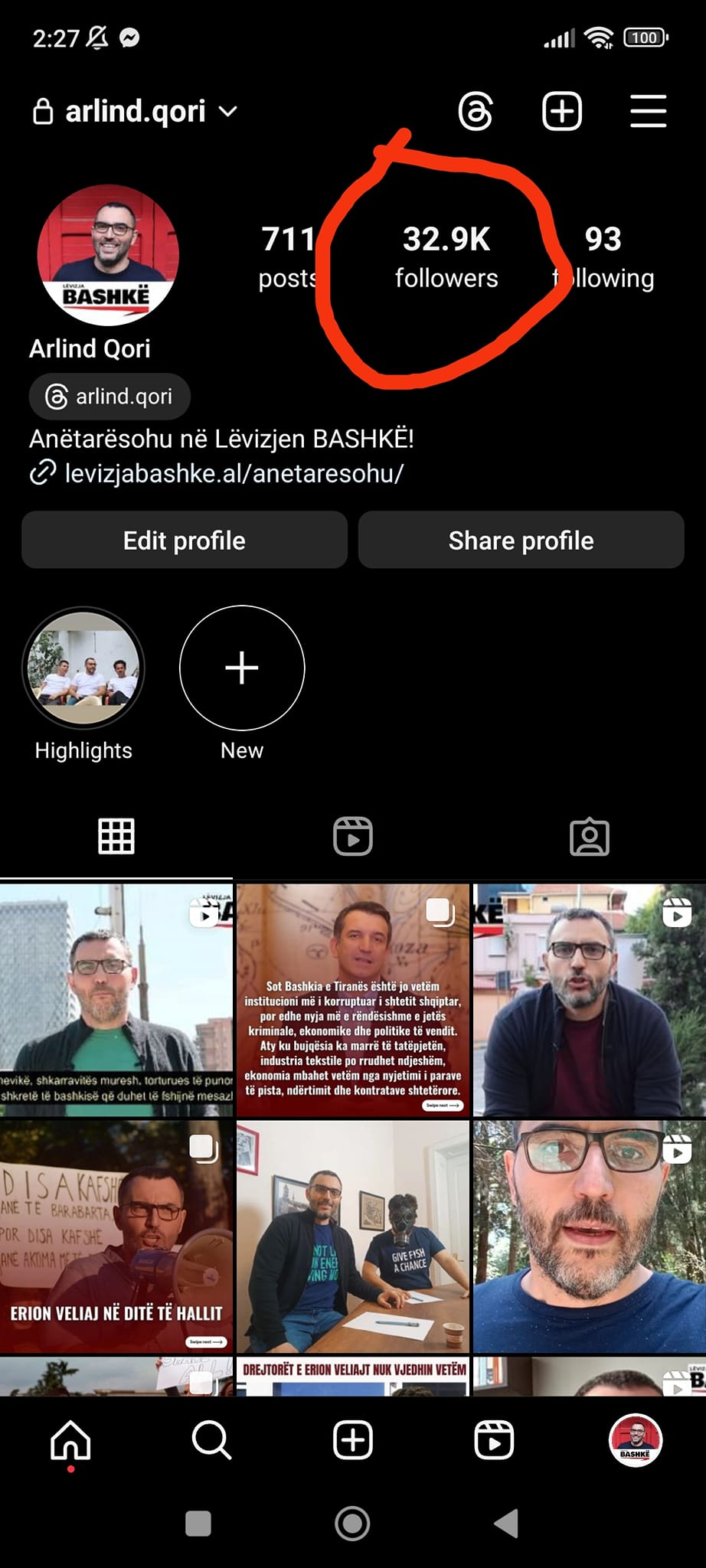 “Sot në orët e para të mëngjesit profilit tim të lodhur në Instagram iu shtuan rreth 30.000 ndjekës me profile të rreme. Me sa kuptoj, kjo është një taktikë sulmi për të ulur ndjekshmërinë reale ose për të mbyllur profilin. Besoj se këtë “dhuratë” e kam merituar për shkak të qëndrimeve të forta kritike ndaj Erion Veliajt për skandalin e fundit korruptiv. Është ironike se si një kryetar bashkie që i akuzon kundërshtarët e vet si bolshevikë, përdor metoda totalitare të heshtimit. Gjithsesi, miqtë e mi, besoj e keni kuptuar se pika ime më e fortë nuk janë rrjetet sociale. Duket paradoksale, por ndjekshmëria ime virtuale është më e ulët (në Instagram rreth 6-7 herë) sesa numri i votave të marra në Tiranë. Shtylla kurrizore e angazhimit tim dhe të aktivistëve të Lëvizjes BASHKË është dalja fizikisht në rrugë, takimet me qytetarët dhe inkurajimi reciprok për t’iu kundërvënë të keqes. Mund të na zhdukin nga të gjitha televizionet. Mund të na mbyllin të gjitha dritaret në rrjetet sociale. Prapëseprapë: