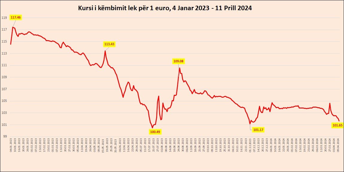 Sipas kursit zyrtar të këmbimit të Bankës së Shqipërisë, Euro u këmbye të enjten me 101.65 lekë, duke zbritur për herë të parë këtë vit poshtë kufirit të 102 lekëve. Ky është niveli më i ulët i kursit të këmbimit Euro-Lek që nga data 7 dhjetor 2023.