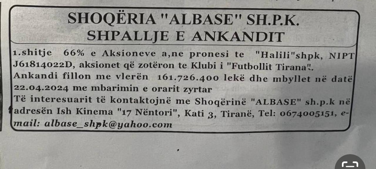 66% e Aksioneve a,ne pronesi te”Halili”shpk, NIPTJ61814022D, aksionet që zotëron te Klubi i “Futbollit Tirana”.Ankandi fillon me vlerën 161.726.400 lekë dhe mbyllet në datë 22.04.2024 me mbarimin e orarit zyrtar.