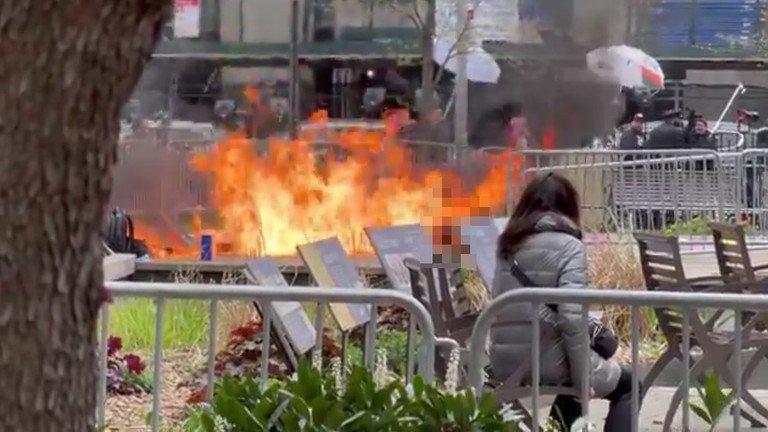 Dëshmitarët i thanë CNN se ai kishte shpërndarë pamflete përpara se të lyhej me benzinë dhe të ndizte zjarrin. Departamenti i Policisë së Nju Jorkut u tha gazetarëve se oficerët “ende po mbledhin informacion” për atë që ndodhi.