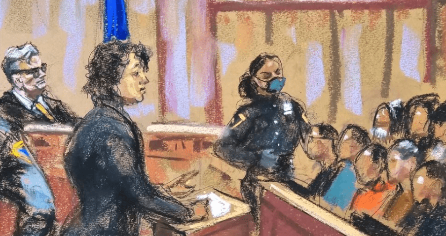 Faktikisht ka disa pamje filmike të gjyqit që shfaqen në ekranet e një dhome pranë sallës kryesore. Të hënën kjo dhomë ishte e tejmbushur me gazetarë, punonjës të gjykatës dhe individë nga publiku. Mes tyre ishte edhe Ron Sinibaldi, ish llogaritar nga qyteti Long Island, i cili hyri në radhë për të siguruar një vend në orët e vona të një nate më parë.