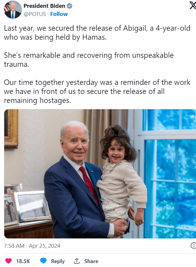 “Vitin e kaluar arritëm lirimin e Abigail, një vajzë 4-vjeçare e ndaluar nga Hamasi. Ajo është e jashtëzakonshme dhe po shërohet nga një traumë e pashpjegueshme. Koha që kaluam së bashku dje ishte një kujtesë e punës që kemi përpara për të siguruar lirimin e të gjithë pengjeve të mbetura”,-shkruan Biden