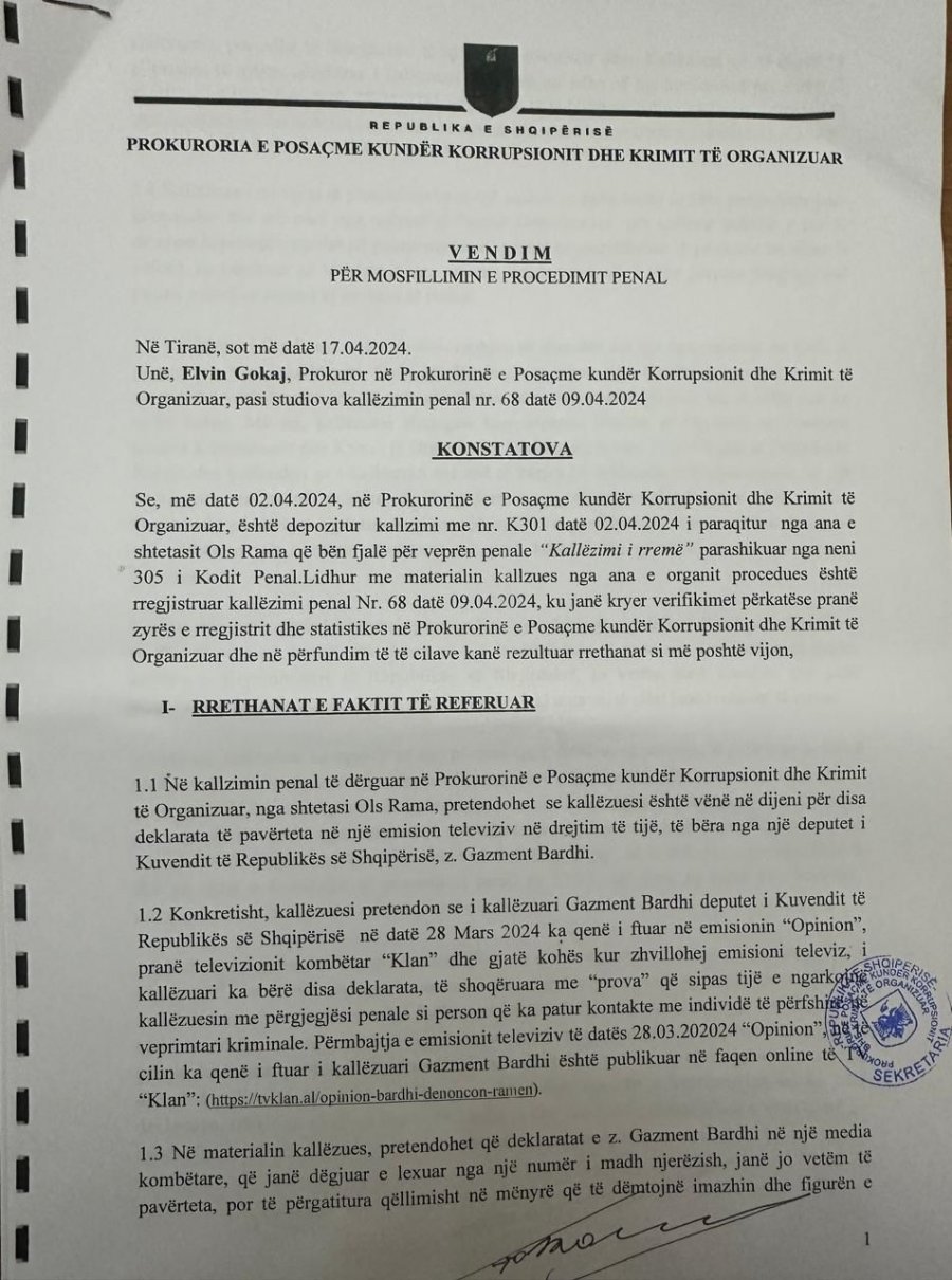 Prokuroria e Posaçme Kundër Korrupsionit dhe Krimit të Organizuar nuk ka pranuar kallëzimin e Olsi Ramës ndaj deputetit të PD-së Gazment Bardhit, duke konstatuar se nuk ka asnjë shpifje dhe asnjë kallëzim të rremë.