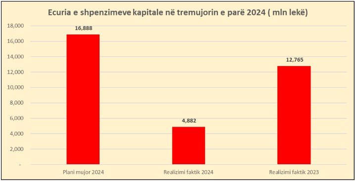 Në tremujorin e parë të vitit 2023 buxheti i shtetit ka alokuar vetëm 4,8 miliardë lekë investime. Kjo shumë është 71 për qind më e ulët se, plani i tremujorit 2024, ndërsa ishte gjithashtu 61 për qind më e ulët se fakti i vitit të kaluar në të njëjtën periudhë të vitit 2023.