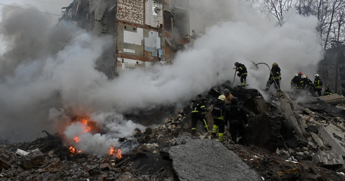 Ukrainian rescue workers clear debris as fire fighters extinguish a fire at the site of a missile attack in Kharkiv on January 23, 2024. Dozens of people were injured and two killed following an overnight aerial barrage by Russian forces targeting the Ukrainian capital Kyiv and the second-largest city Kharkiv, officials said on January 23, 2024. (Photo by SERGEY BOBOK / AFP) (Photo by SERGEY BOBOK/AFP via Getty Images)