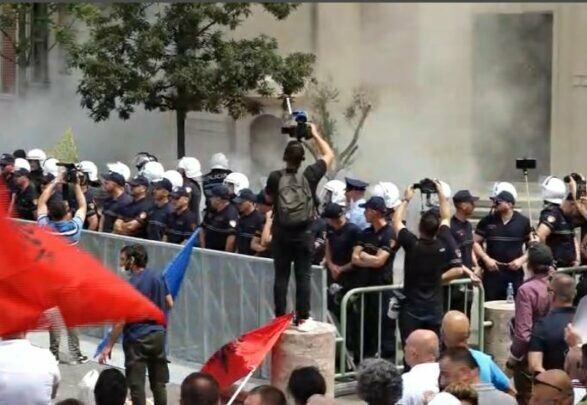 Disa protestues kanë hedhur molotovë dhe flakadanë në drejtim të bashkisë, ndërsa policia ka apeluar me megafon që të ndalen sulmet.