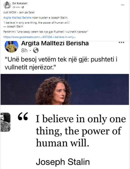 Në një postim të fundit, Argita Malltezi ka cituar në një postim të saj shprehjen e ish-udhëheqësit komunist të Bashkimit Sovietik, Joseph Stalin.