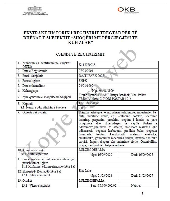 Dajti Park 07, një kompani në pronësi aksionere të familjarëve të deputetit socialist të Tiranës, Xhemal Qefalia, nga viti 2014 deri 2023 ka përfituar 1998 transaksione me vlerë totale 21.8 miliard lekë.