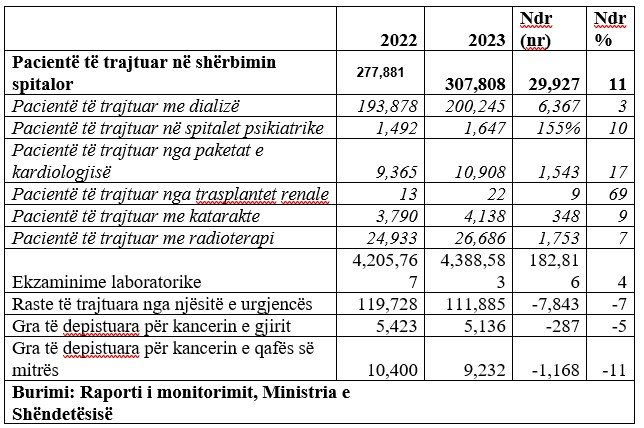 Sipas të dhënave të raportit të Monitorimit të Ministrisë së Shëndetësisë dhe Mbrojtjes Sociale, për vitin 2023, numri i pacientëve të trajtuar në shërbimet me shtretër rezulton 307,808 pacientë apo 11% më shumë nga e njëjta periudhë e vitit të kaluar.