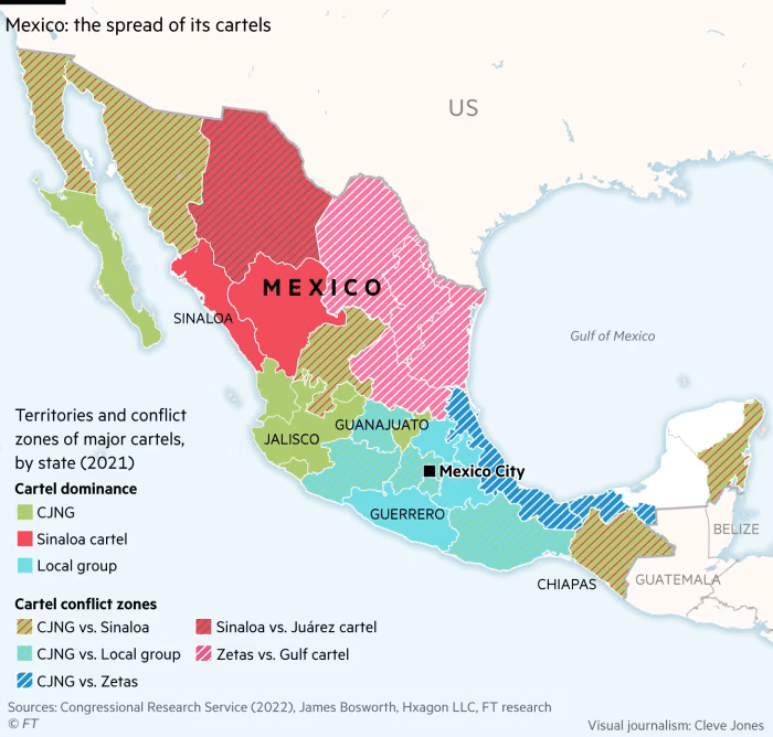 Për më shumë se një dekadë, grupet mbizotëruese të drogës janë copëzuar, duke prodhuar një mori bandash më të vogla të ndarë që luftojnë në terren. Sot, dy kartelet më të mëdha dhe më të fuqishme, karteli Sinaloa dhe karteli i Gjeneratës së Re Jalisco (CJNG), po përplasen me rivalë më të vegjël si Viagras, Squirrels dhe Scorpions.