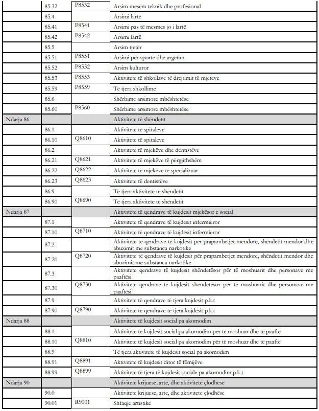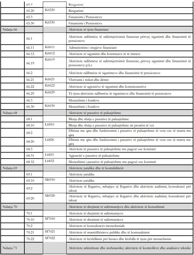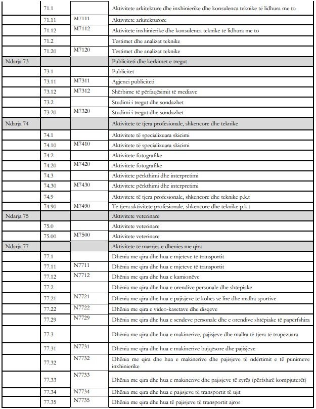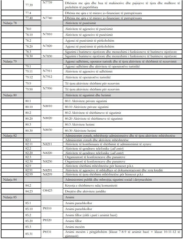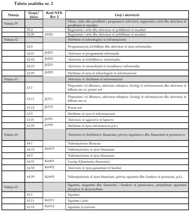 Sipas ndarjes në aktivitete në taksimin e ri do të përfshihen llojet e veprimtarisë, si: Filma, video dhe prodhimi i programeve televizivë, regjistrimi i zërit dhe aktivitete të prodhimit të muzikës; Shërbime të teknologjisë së informacionit; Aktivitete të shërbimit të informacionit; Aktivitete të shërbimeve financiare, përveç sigurimeve dhe financimit të pensioneve; Sigurimi, risigurimi dhe financimi i fondeve të pensioneve, përjashtuar sigurimin shoqëror të detyrueshëm; Aktivitete ndihmëse të ndërmjetësimit financiar përveç sigurimit dhe financimit të pensioneve; Aktivitete të pasurive të paluajtshme; Aktivitete juridike dhe të kontabilitetit; Aktivitete arkitekture dhe inxhinierike; Aktivitete të kontrolleve dhe analizave teknike; Publiciteti dhe kërkimet e tregut; Aktivitete të tjera profesionale, shkencore dhe teknike; Aktivitete veterinare; Aktivitete të marrjes e dhënies me qira; Aktivitete të punësimit; Agjenci udhëtimi, operator turistik dhe të tjera aktivitete të shërbimit të rezervimit; Administrim zyrash mbështetje administrative dhe të tjera aktivitete mbështetëse; Administrimi publik dhe mbrojtja; Sigurimi social i detyrueshëm; Arsimi; Aktivitete të shëndetit; Aktivitete të qendrave të kujdesit mjekësor e social; Aktivitete të kujdesit social pa akomodim; Aktivitete krijuese; Arte dhe aktivitete çlodhëse; Aktivitete sportive argëtuese dhe çlodhëse; Aktivitete të tjera shërbimi.