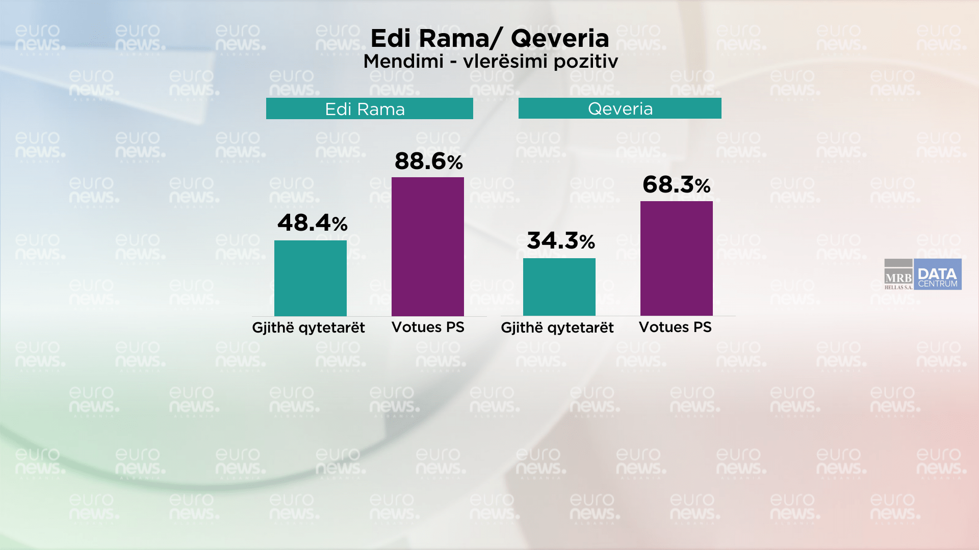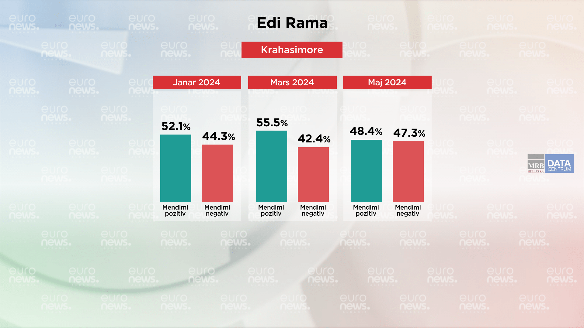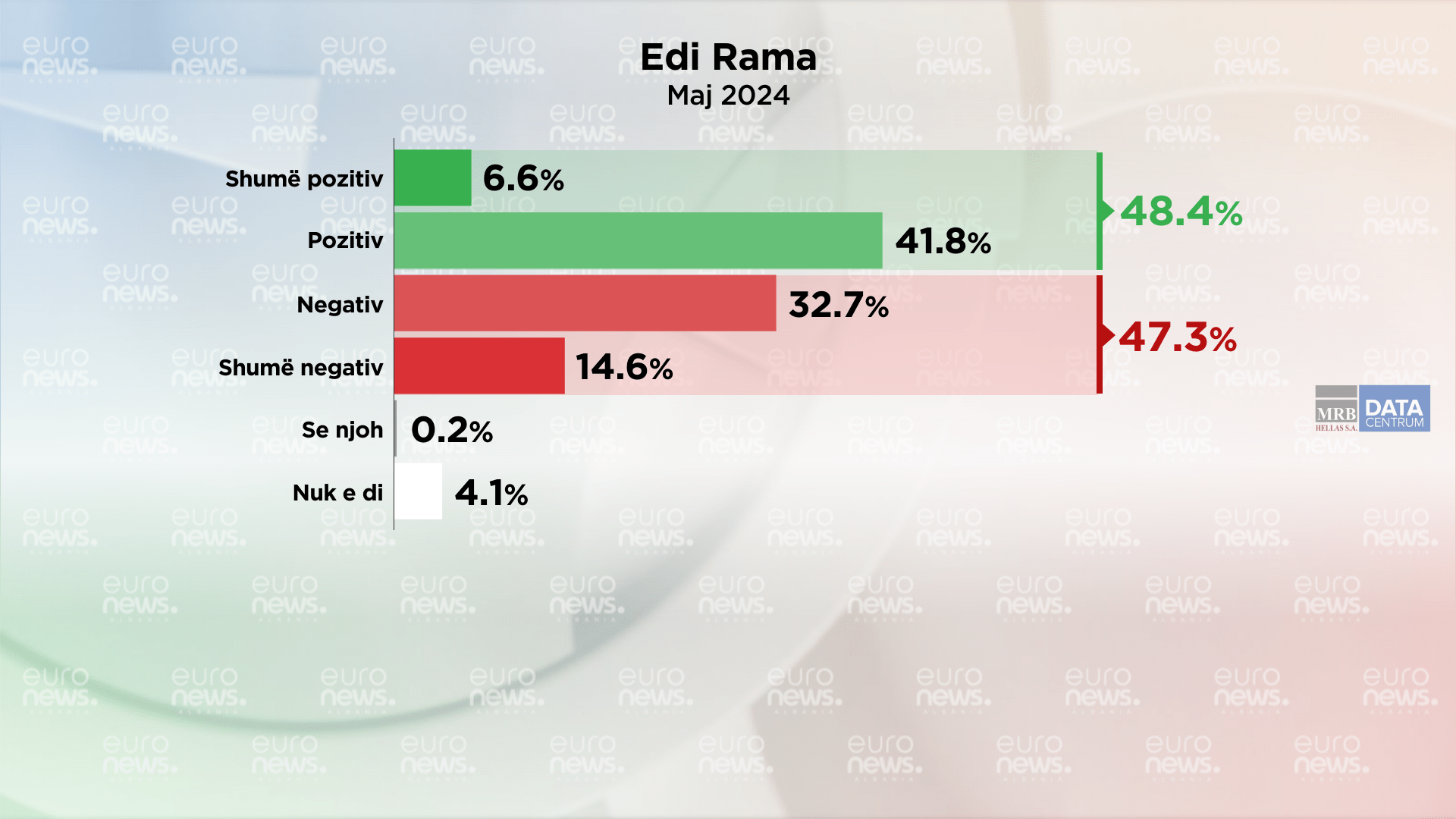 Sipas Barometrit – Euronews Albania (48.4 %) e të intervistuarve ballë për ballë nga Data Centrum, kanë mendim pozitiv për kreun e qeverisë, ndërsa (47.3%) kanë mendim negativ për të.