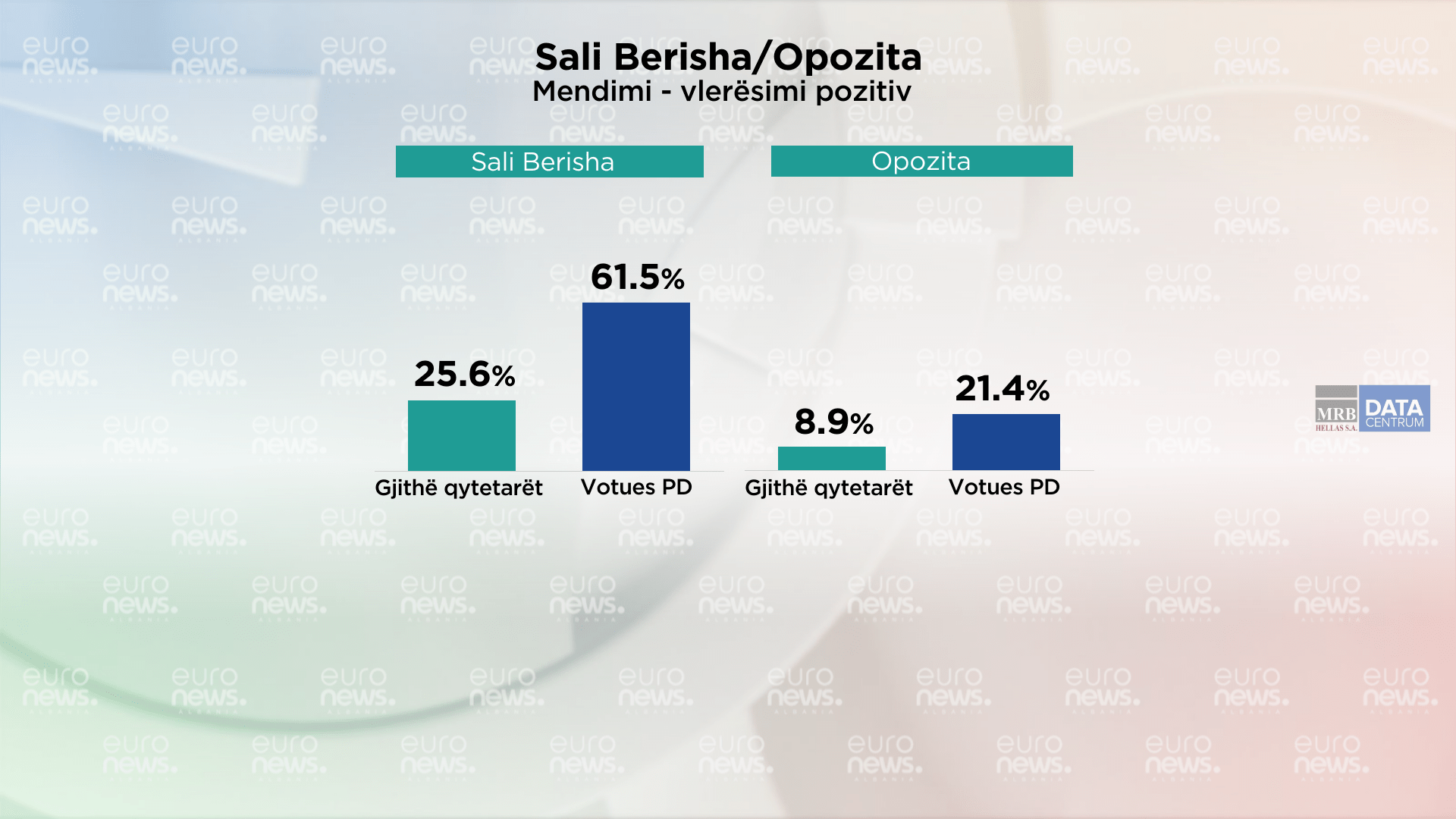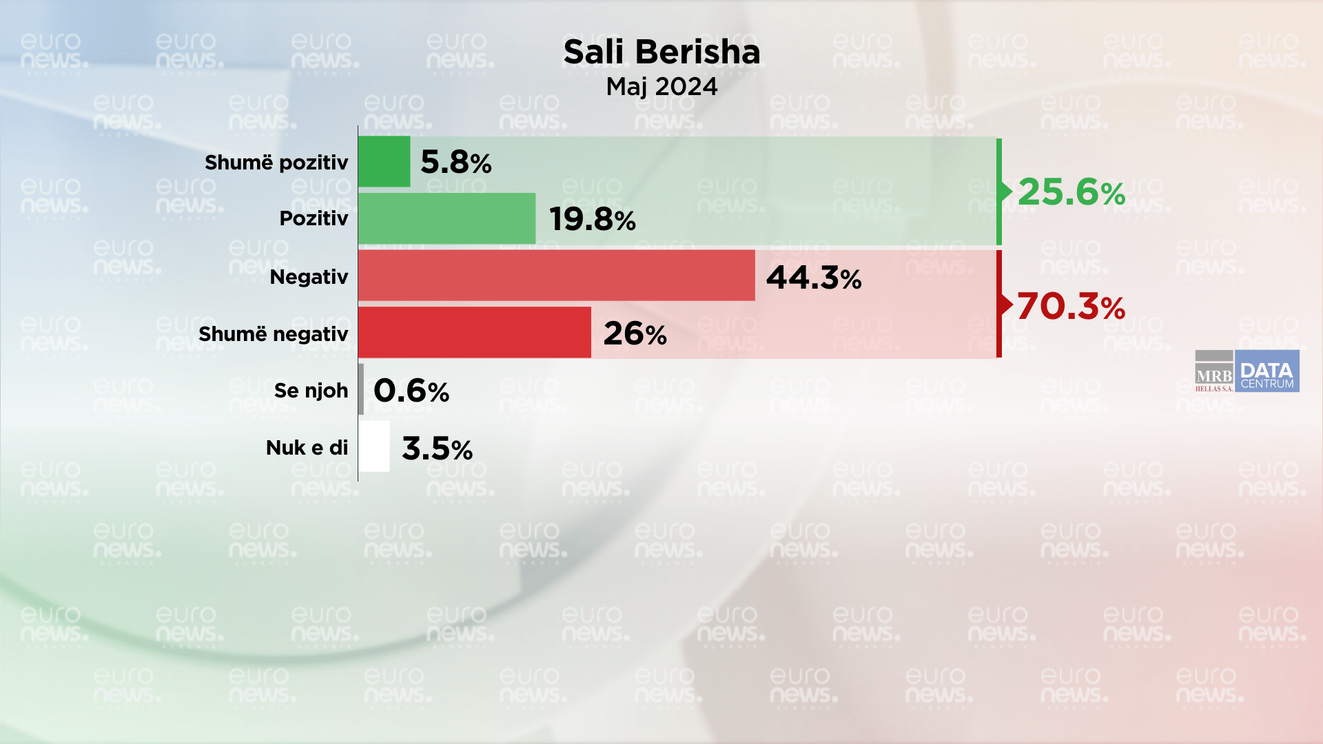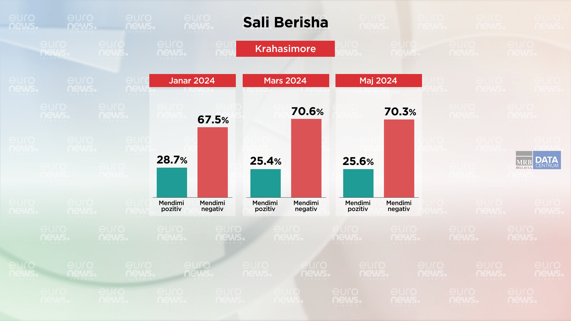 Në janar pëlqyeshmëria për Sali Berishën ka qenë (28.7%) ndërsa sot është (25.6 %). Mendimi negative në janar 2024 ka qenë (67.5 %) dhe sot është (70.3 %).