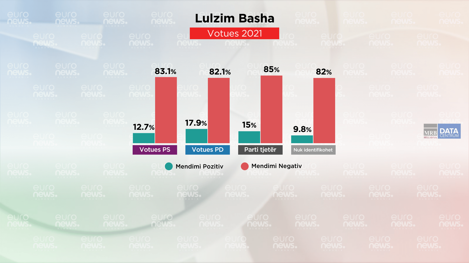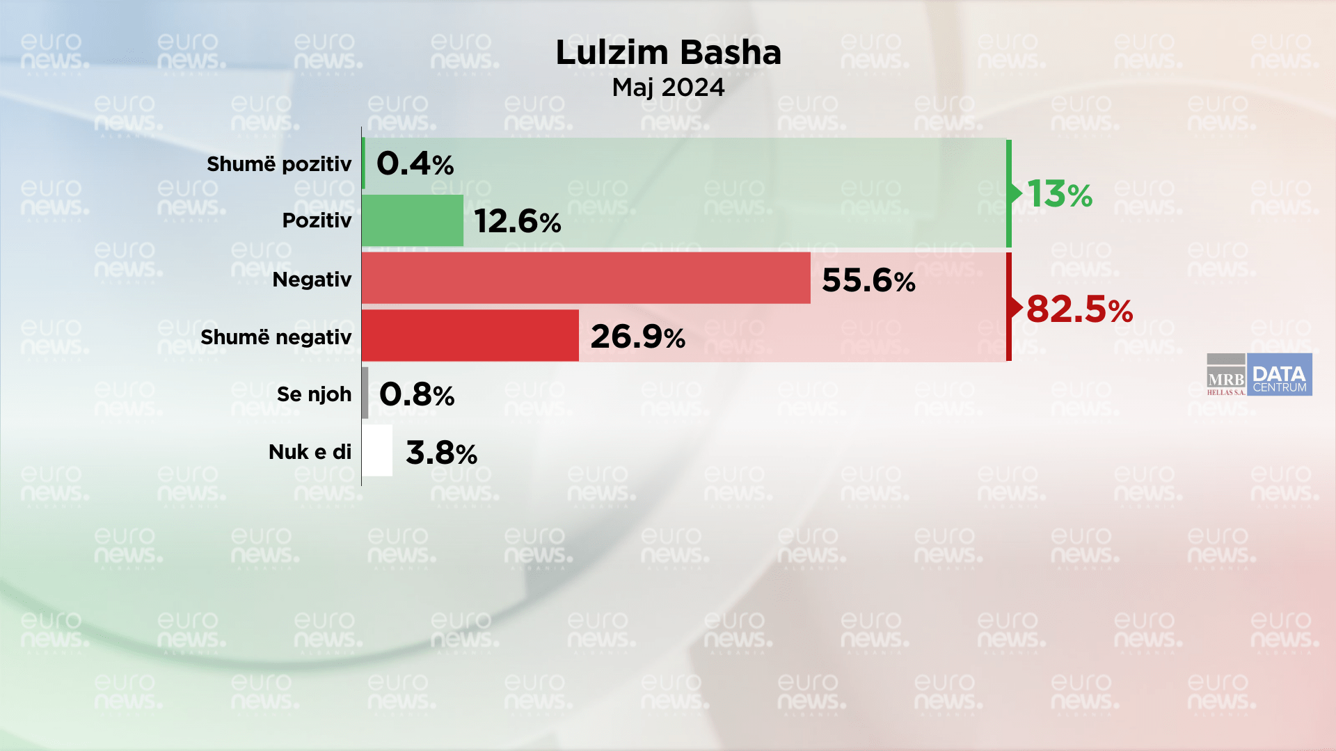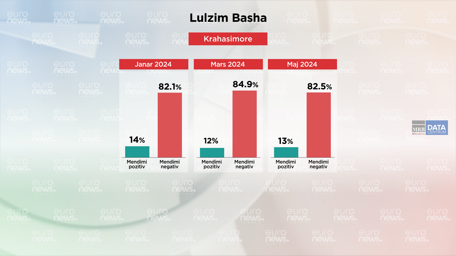 Mendimi pozitiv për të në Mars 2024 ka qenë (12 %) dhe sot është (13 %). Mendimi negativ për Lulzim Bashën në Mars 2024 ka qenë (84.9 %) dhe sot është (82.5 %).