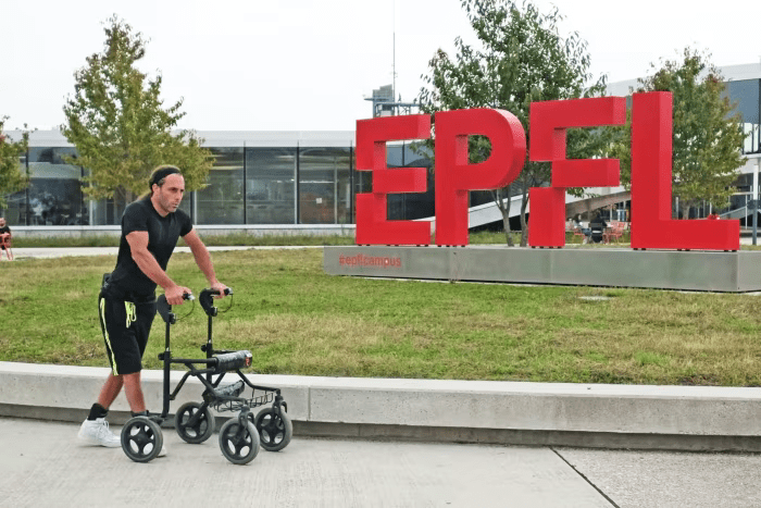 “Mjekët e mi më thanë atëherë se nuk do mund të qëndroja më në këmbë, e lëre më të ecja,” thotë Roçati, i cili është 32 vjeç. Më pas ai aktivizon një seri elektrodash që neurokirurgët në Lozanë i futën përgjatë palcës kurrizore në një operacion pionier në vitin 2020.
