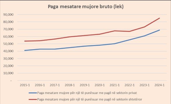 Paga mesatare mujore bruto në sektorin publik arriti në 84,979 lekë në tremujorin e parë të vitit 2024. Niveli i saj ishte 11,774 lekë më i lartë se e njëjta periudhë e vitit të kaluar, ose 16% më shumë.
