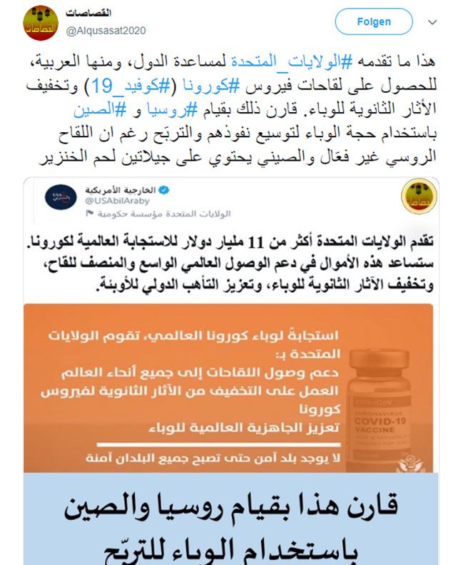 Kjo është ajo që #Shtetet e Bashkuara po ofrojnë për të ndihmuar vendet, përfshirë vendet arabe, të marrin vaksinat kundër #Coronavirus (#Covid_19) dhe të zbusin efektet dytësore të pandemisë. Krahasoni këtë me #Rusia dhe #Kina duke përdorur justifikimin e pandemisë për të zgjeruar ndikimin dhe përfitimin e tyre edhe pse vaksina ruse është joefektive dhe vaksina kineze përmban xhelatinë derri