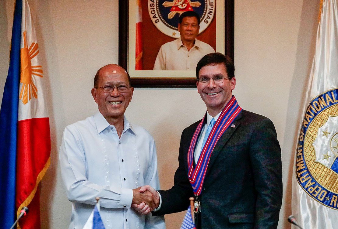 Sekretari i Mbrojtjes i SHBA Mark Esper shtrëngon duart me homologun e tij filipinas Delfin Lorenzana gjatë një konference shtypi në Filipine në nëntor 2019. Po atë vit, Esper nënshkroi një urdhër sekret që më vonë hapi rrugën për nisjen e antivaksit klandestin të ushtrisë amerikane fushatë propagandistike